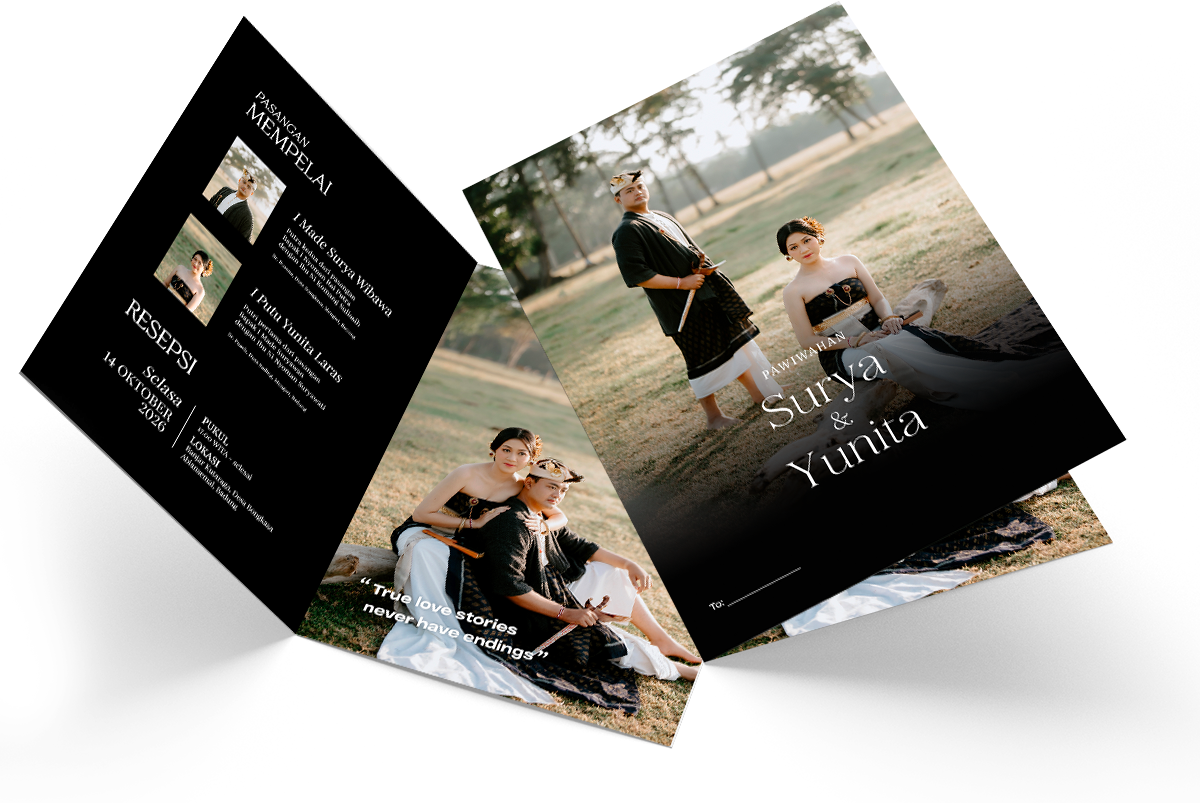 Pawiwahan.id menyediakan jasa pembuatan undangan digital/online dan print/cetak, dengan desain elegan, praktis dan mudah untuk digunakan maupun dibagikan. Undangan pernikahan digital menjadi pilihan tepat untuk para calon pengantin masa kini di Bali, Indonesia untuk menyebarkan hari bahagia pernikahannya.